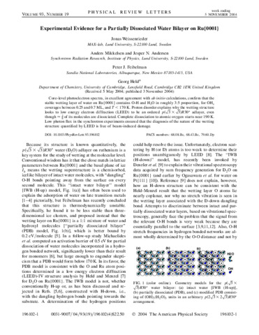 Weissenrieder, J., Mikkelsen, A., Andersen, J., Feibelman, P. and Held, G. (2004) Experimental evidence for a partially dissociated water bilayer on Ru{0001}. Physical Review Letters, 93 (19). 19610. ISSN 0031-9007 doi: 10.1103/PhysRevLett.93.196102