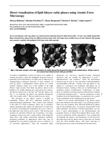 Rittman, M., Frischherz, M., Burgmann, F., Hartley, P. G. and Squires, A. (2010) Direct visualisation of lipid bilayer cubic phases using Atomic Force Microscopy. Soft Matter, 6 (17). pp. 4058-4061. ISSN 1744-683X doi: 10.1039/c002968h