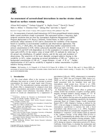 McComiskey, A., Feingold, G., Frisch, A. S., Turner, D. D., Miller, M. A., Chiu, J. C., Min, Q. and Ogren, J. A. (2009) An assessment of aerosol‐cloud interactions in marine stratus clouds based on surface remote sensing. Journal of Geophysical Research, 114 (D9). D09203. ISSN 0148-0227 doi: 10.1029/2008JD011006