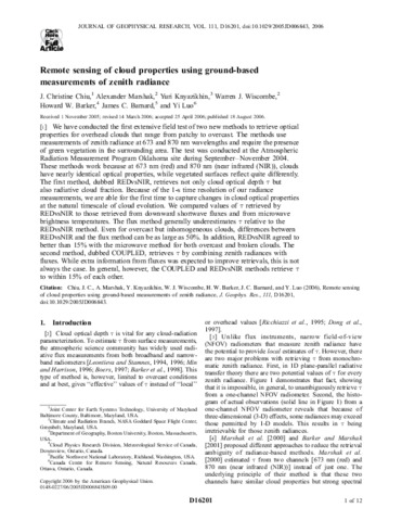 Chiu, J. C., Marshak, A., Knyazikhin, Y., Wiscombe, W.J., Barker, H.W., Barnard, J.C. and Luo, Y. (2006) Remote sensing of cloud properties using ground-based measurements of zenith radiance. Journal of Geophysical Research, 111 (D16). D16201. ISSN 0148-0227 doi: 10.1029/2005JD006843