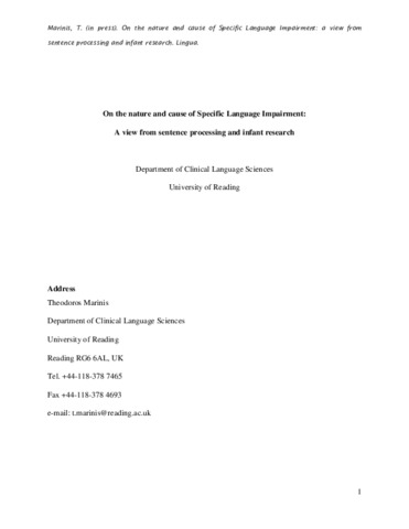 Marinis, T. (2011) On the nature and cause of Specific Language Impairment: a view from sentence processing and infant research. Lingua, 121 (3). pp. 463-475. ISSN 0024-3841 doi: 10.1016/j.lingua.2010.10.010