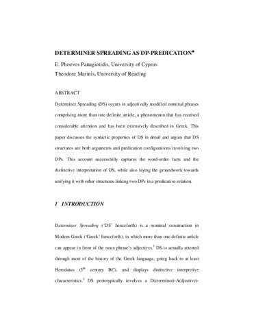Panagiotidis, E. P. and Marinis, T. (2011) Determiner spreading as DP-predication. Studia Linguistica, 65 (3). pp. 268-298. ISSN 0039-3193 doi: 10.1111/j.1467-9582.2011.01186.x