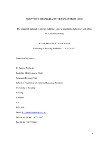 Thirlwall, K. J. and Creswell, C. S. (2010) The impact of maternal control on children’s anxious cognitions, behaviours and affect: an experimental study. Behaviour Research and Therapy, 48 (19). pp. 1041-1046. ISSN 0005-7967 doi: 10.1016/j.brat.2010.05.030