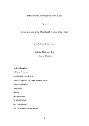 Parkinson, M. and Creswell, C. (2011) Worry and problem-solving skills and beliefs in primary school children. British Journal of Clinical Psychology, 50 (1). pp. 106-112. ISSN 2044-8260 doi: 10.1348/014466510X523887