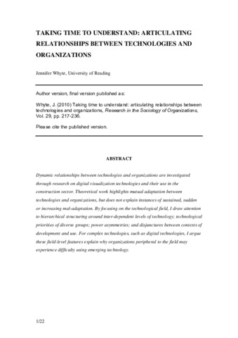 Whyte, J. (2010) Taking time to understand: articulating relationships between technologies and organizations. Research in the Sociology of Organizations, 29. pp. 217-236. ISSN 0733-558X doi: 10.1108/S0733-558X(2010)0000029016
