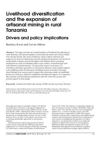 Kwai, B. and Hilson, G. (2010) Livelihood diversification and the expansion of artisanal mining in rural Tanzania: drivers and policy implications. Outlook on Agriculture, 39 (2). pp. 141-147. ISSN 0030-7270 doi: 10.5367/000000010791745358