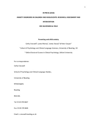 Creswell, C., Murray, L., Stacey, J. and Cooper, P. (2011) Parenting and child anxiety. In: Silverman, W. K. and Field, A. P. (eds.) Anxiety disorders in children and adolescents. 2nd edition. Cambridge child and adolescent psychiatry. Cambridge University Press, Cambridge. ISBN 9780521721486