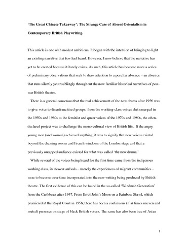 Saunders, G. (2010) ‘The great Chinese takeaway’: the strange case of absent Orientalism in contemporary British playwriting. In: Huber, W., Rubik, M. and Novak, J. (eds.) Staging interculturality: contemporary drama in English. Wissenschaftlicher Verlag Trier, Germany, pp. 65-74. ISBN 9783868212327