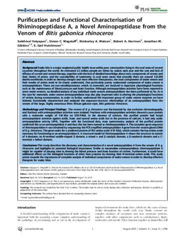 Vaiyapuri, S. orcid id iconORCID: https://orcid.org/0000-0002-6006-6517, Wagstaff, S. C., Watson, K. A. orcid id iconORCID: https://orcid.org/0000-0002-9987-8539, Harrison, R. A., Gibbins, J. M. orcid id iconORCID: https://orcid.org/0000-0002-0372-5352 and Hutchinson, E. G. (2010) Purification and functional characterisation of rhiminopeptidase A, a novel aminopeptidase from the venom of Bitis gabonica rhinoceros. PLoS Neglected Tropical Diseases, 4 (8). e796. ISSN 1935-2735 doi: 10.1371/journal.pntd.0000796