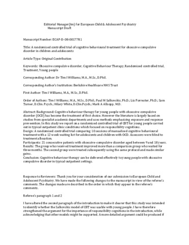 | Uncontrolled Keywords | Obsessive compulsive disorder - Cognitive behaviour therapy - Randomised controlled trial - Treatment - Young people |