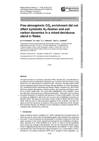 Free atmospheric CO2 enrichment increased above ground biomass but did not affect symbiotic N2-fixation and soil carbon dynamics in a mixed deciduous stand in Wales
