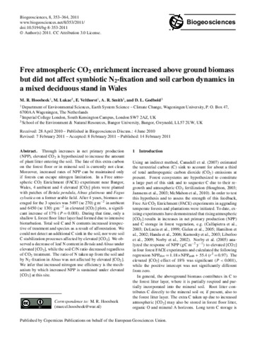 Hoosbeek, M. R., Lukac, M. orcid id iconORCID: https://orcid.org/0000-0002-8535-6334, Velhorst, E. J., Smith, A. R. and Godbold, D. L. (2011) Free atmospheric CO2 enrichment increased above ground biomass but did not affect symbiotic N2-fixation and soil carbon dynamics in a mixed deciduous stand in Wales. Biogeosciences, 8 (2). pp. 353-364. ISSN 1726-4170 doi: 10.5194/bg-8-353-2011