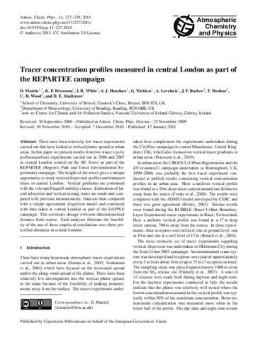 Martin, D., Petersson, K. F., White, I. R., Henshaw, S. J., Nickless, G., Lovelock, A., Barlow, J. F., Dunbar, T., Wood, C. R. and Shallcross, D. E. (2011) Tracer concentration profiles measured in central London as part of the REPARTEE campaign. Atmospheric Chemistry and Physics, 11 (1). pp. 227-239. ISSN 1680-7316 doi: 10.5194/acp-11-227-2011