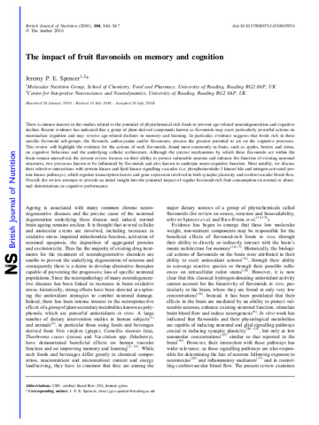 There is intense interest in the studies related to the potential of phytochemical-rich foods to prevent age-related neurodegeneration and cognitive decline. Recent evidence has indicated that a group of plant-derived compounds known as flavonoids may exert particularly powerful actions on mammalian cognition and may reverse age-related declines in memory and learning. In particular, evidence suggests that foods rich in three specific flavonoid sub-groups, the flavanols, anthocyanins and/or flavanones, possess the greatest potential to act on the cognitive processes. This review will highlight the evidence for the actions of such flavonoids, found most commonly in fruits, such as apples, berries and citrus, on cognitive behaviour and the underlying cellular architecture. Although the precise mechanisms by which these flavonoids act within the brain remain unresolved, the present review focuses on their ability to protect vulnerable neurons and enhance the function of existing neuronal structures, two processes known to be influenced by flavonoids and also known to underpin neuro-cognitive function. Most notably, we discuss their selective interactions with protein kinase and lipid kinase signalling cascades (i.e. phosphoinositide-3 kinase/Akt and mitogen-activated protein kinase pathways), which regulate transcription factors and gene expression involved in both synaptic plasticity and cerebrovascular blood flow. Overall, the review attempts to provide an initial insight into the potential impact of regular flavonoid-rich fruit consumption on normal or abnormal deteriorations in cognitive performance.