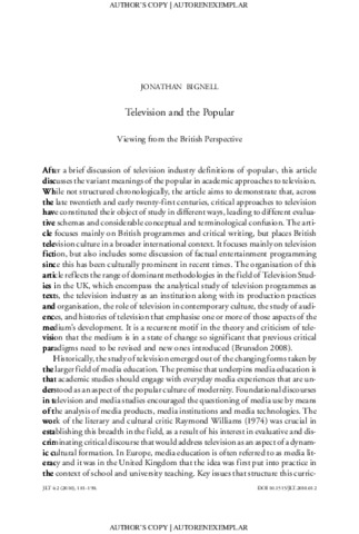 Bignell, J. orcid id iconORCID: https://orcid.org/0000-0003-4874-1601 (2010) Television and the popular: viewing from the British perspective. Journal of Literary Theory, 4 (2). pp. 181-198. ISSN 1862-5290 doi: 10.1515/JLT.2010.012