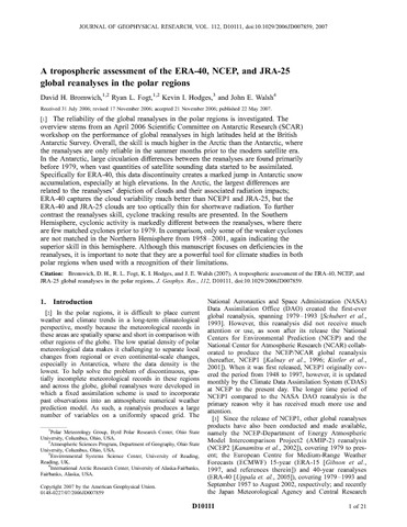 A Tropospheric Assessment of the ERA-40, NCEP, and JRA-25 Global Reanalyses in the Polar Regions.