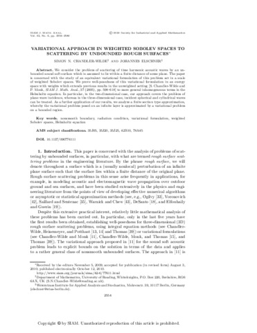Chandler-Wilde, S. N. orcid id iconORCID: https://orcid.org/0000-0003-0578-1283 and Elschner, J. (2010) Variational approach in weighted Sobolev spaces to scattering by unbounded rough surfaces. SIAM Journal on Mathematical Analysis (SIMA), 42 (6). pp. 2554-2580. ISSN 0036-1410 doi: 10.1137/090776111