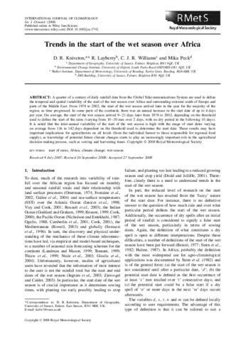 Kniveton, D. R., Layberry, R., Williams, C. J. R. and Peck, M. (2009) Trends in the start of the wet season over Africa. International Journal of Climatology, 29 (9). pp. 1216-1225. ISSN 0899-8418 doi: 10.1002/joc.1792