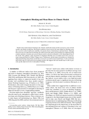 Scaife, A. A., Woollings, T., Knight, J., Martin, G. and Hinton, T. (2010) Atmospheric blocking and mean biases in climate models. Journal of Climate, 23 (23). pp. 6143-6152. ISSN 1520-0442 doi: 10.1175/2010JCLI3728.1