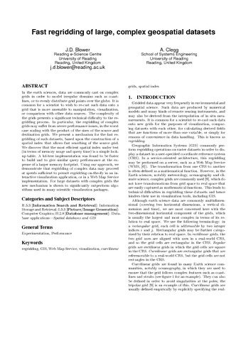 Blower, J. and Clegg, A. (2011) Fast regridding of large, complex geospatial datasets. In: Com.Geo 2011: The 2nd International Conference on Computing for Geospatial Research & Applications, 23-25 May 2011, Washington D.C., pp. 1-6. (10.1145/1999320.1999350)
