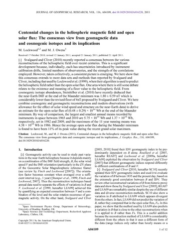 Centennial changes in the heliospheric magnetic field and open solar flux: the consensus view from geomagnetic data and cosmogenic isotopes and its implications.