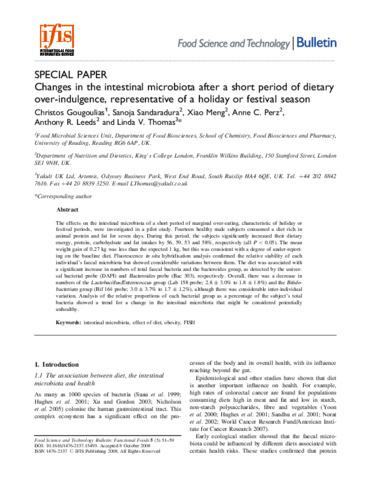 Gougoulias, C., Sandaradura, S., Meng, X., Perz, A. C., Leeds, A. R. and Thomas, L. V. (2008) Changes in the intestinal microbiota after a short period of dietary over-indulgence, representative of a holiday or festival season. Food Science and Technology Bulletin: Functional Foods, 5 (5). pp. 51-59. ISSN 1476-2137