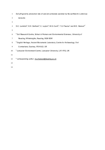 Lambkin, D. C., Gwilliam, K. H., Layton, C., Canti, M. G., Piearce, T. G. and Hodson, M. E. (2011) Soil pH governs production rate of calcium carbonate secreted by the earthworm Lumbricus terrestris. Applied Geochemistry, 26 (Supple). S64-S66. ISSN 0883-2927 doi: 10.1016/j.apgeochem.2011.03.032
