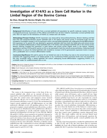 Chen, B., Mi, S., Wright, B. and Connon, C. J. (2010) Investigation of K14/K5 as a stem cell marker in the limbal region of the bovine cornea. PLoS ONE, 5 (10). e13192. ISSN 1932-6203 doi: 10.1371/journal.pone.0013192