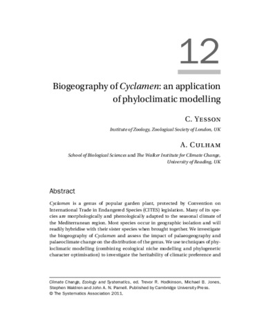 Yesson, C. and Culham, A. orcid id iconORCID: https://orcid.org/0000-0002-7440-0133 (2011) Biogeography of cyclamen: an application of phyloclimatic modelling. In: Hodkinson, T., Jones, M., Waldren, S. and Parnell, J. (eds.) Climate change, ecology and systematics. Cambridge University Press, pp. 265-279. ISBN 9780521766098 (Chapter 12)