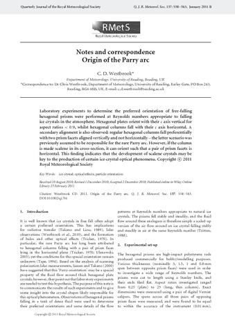 Laboratory experiments to determine the preferred orientation of free-falling hexagonal prisms were performed at Reynolds numbers appropriate to falling ice crystals in the atmosphere. Hexagonal plates orient with their c axis vertical for aspect ratios < 0.9, whilst hexagonal columns fall with their c axis horizontal. A secondary alignment is also observed: regular hexagonal columns fall preferentially with two prism facets aligned vertically and not horizontally โ the latter scenario was previously assumed to be responsible for the rare Parry arc. However, if the column is made scalene in its cross-section, it can orient such that a pair of prism facets is horizontal. This finding indicates that the development of scalene crystals may be key to the production of certain ice-crystal optical phenomena