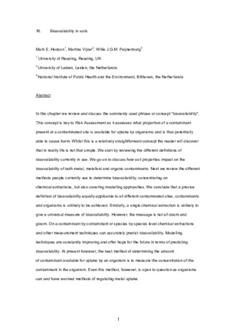 Hodson, M. E., Vijver, M. G. and Peijnenberg, W. J. G. M. (2011) Bioavailability in soils. In: Swartjes, F. A. (ed.) Dealing with contaminated sites: from theory towards practical application. Springer, pp. 721-746. ISBN 9789048197569 doi: 10.1007/978-90-481-9757-6