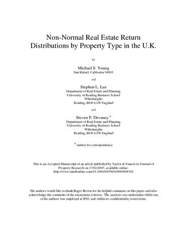 Young, M., Lee, S. and Devaney, S. orcid id iconORCID: https://orcid.org/0000-0002-1916-2558 (2006) Non-normal real estate return distributions by property type in the UK. Journal of Property Research, 23 (2). pp. 109-133. ISSN 1466-4453 doi: 10.1080/09599910600800302