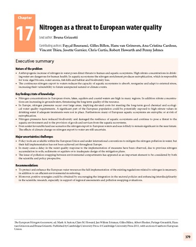 Grizzetti, B., Bouraoui, F., Billen, G., van Grinsven, H., Cardoso, A. C., Thieu, V., Garnier, J., Curtis, C., Howarth, R. W. and Johnes, P. (2011) Nitrogen as a threat to European water quality. In: Sutton, M. A., Howard, C. M., Erisman, J. W., Billen, G., Bleeker, A., Grennfelt, P., van Grinsven, H. and Grizzetti, B. (eds.) European Nitrogen Assessment. Cambridge University Press, UK, pp. 379-404. ISBN 9781107006126