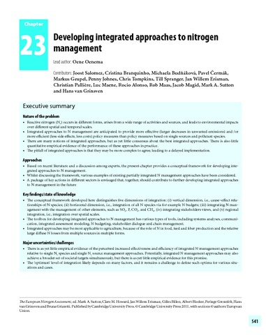 Oenema, O., Salomez, J., Branquinho, C., Budnakova, M., Cermak, P., Geupel, P., Johnes, P., Tomkins, C., Spranger, T., Erisman, J. W., Pallìere, C., Maene, L., Alonso, R., Maas, R., Magid, J., Sutton, M. A. and van Grinsven, H. (2011) Developing integrated approaches to nitrogen management. In: Sutton, M. A., Howard, C. M., Erisman, J. W., Billen, G., Bleeker, A., Grennfelt, P., van Grinsven, H. and Grizzetti, B. (eds.) European Nitrogen Assessment. Cambridge University Press, UK, pp. 541-550. ISBN 9781107006126