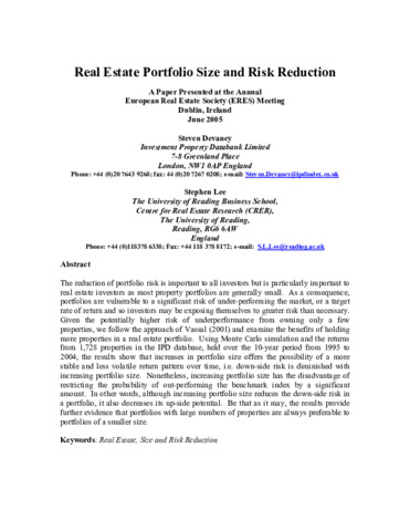 The reduction of portfolio risk is important to all investors but is particularly important to real estate investors as most property portfolios are generally small. As a consequence, portfolios are vulnerable to a significant risk of under-performing the market, or a target rate of return and so investors may be exposing themselves to greater risk than necessary. Given the potentially higher risk of underperformance from owning only a few properties, we follow the approach of Vassal (2001) and examine the benefits of holding more properties in a real estate portfolio. Using Monte Carlo simulation and the returns from 1,728 properties in the IPD database, held over the 10-year period from 1995 to 2004, the results show that increases in portfolio size offers the possibility of a more stable and less volatile return pattern over time, i.e. down-side risk is diminished with increasing portfolio size. Nonetheless, increasing portfolio size has the disadvantage of restricting the probability of out-performing the benchmark index by a significant amount. In other words, although increasing portfolio size reduces the down-side risk in a portfolio, it also decreases its up-side potential. Be that as it may, the results provide further evidence that portfolios with large numbers of properties are always preferable to portfolios of a smaller size.