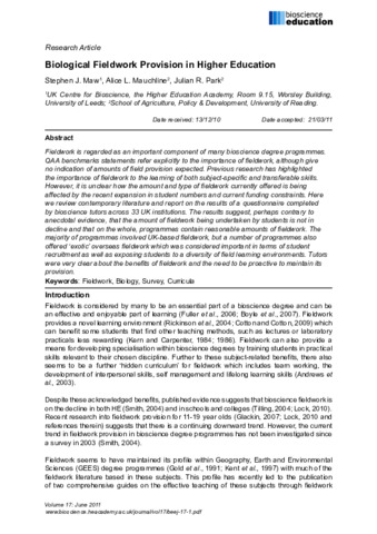 Fieldwork is regarded as an important component of many bioscience degree programmes. QAA benchmarks statements refer explicitly to the importance of fieldwork, although give no indication of amounts of field provision expected. Previous research has highlighted the importance of fieldwork to the learning of both subject-specific and transferable skills. However, it is unclear how the amount and type of fieldwork currently offered is being affected by the recent expansion in student numbers and current funding constraints. Here we review contemporary literature and report on the results of a questionnaire completed by bioscience tutors across 33 UK institutions. The results suggest, perhaps contrary to anecdotal evidence, that the amount of fieldwork being undertaken by students is not in decline and that on the whole, programmes contain reasonable amounts of fieldwork. The majority of programmes involved UK-based fieldwork, but a number of programmes also offered ‘exotic’ overseas fieldwork which was considered important in terms of student recruitment as well as exposing students to a diversity of field learning environments. Tutors were very clear about the benefits of fieldwork and the need to be proactive to maintain its provision.