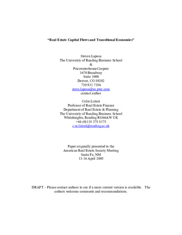 Laposa, S. and Lizieri, C., (2005) Real estate capital flows and transitional economies. Working Papers in Real Estate & Planning. 12/05. Working Paper. University of Reading, Reading. pp27.
