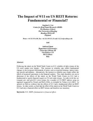 Lee, S. L. and Gheno, A., (2005) The impact of 9/11 on US REIT returns: fundamental or financial? Working Papers in Real Estate & Planning. 27/05. Working Paper. University of Reading, Reading. pp10.