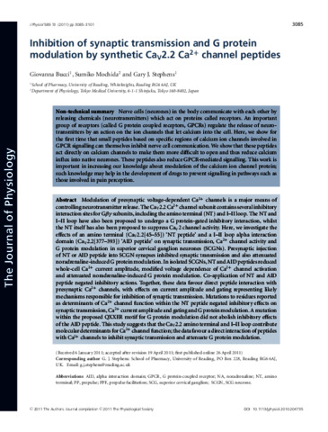 Bucci, G., Mochida, S. and Stephens, G. J. orcid id iconORCID: https://orcid.org/0000-0002-8966-4238 (2011) Inhibition of synaptic transmission and G protein modulation by synthetic CaV2.2 Ca2+ channel peptides. Journal of Physiology, 589 (13). pp. 3085-3101. ISSN 0022-3751 doi: 10.1113/jphysiol.2010.204735