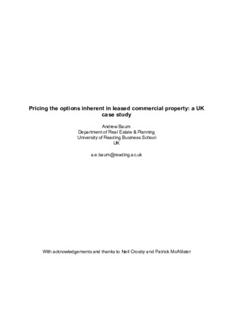 Baum, A., (2003) Pricing the options inherent in leased commercial property: a UK case study. Working Papers in Real Estate & Planning. 09/03. Working Paper. University of Reading, Reading. pp17.