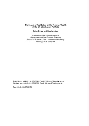 Byrne, P. and Lee, S., (2003) The impact of real estate on the terminal wealth of the UK mixed-asset portfolio. Working Papers in Real Estate & Planning. 05/03. Working Paper. University of Reading, Reading. pp29.