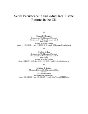 Devaney, S., Lee, S. and Young, M., (2004) Serial persistence in individual real estate returns in the UK. Working Papers in Real Estate & Planning. 13/04. Working Paper. University of Reading, Reading. pp32.