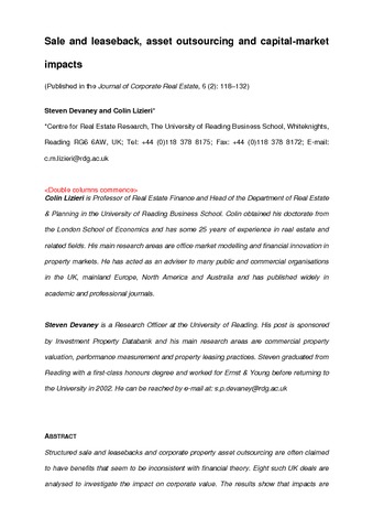 Devaney, S. and Lizieri, C. (2004) Sale and leaseback, asset outsourcing and capital market impacts. Journal of Corporate Real Estate, 6 (2). pp. 118-132. ISSN 1463-001X doi: 10.1108/14630010410812298