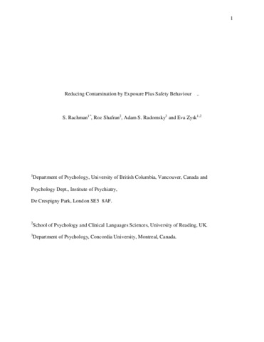 Rachman, J., Shafran, R., Radomsky, A. and Zysk, E. (2011) Reducing contamination by exposure plus safety behaviour. Journal of Behavior Therapy and Experimental Psychiatry, 42 (3). pp. 397-404. ISSN 0005-7916 doi: 10.1016/j.jbtep.2011.02.010