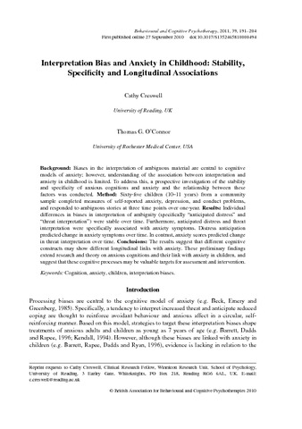 Creswell, C. and O'Connor, T. G. (2011) Interpretation bias and anxiety in childhood: stability, specificity and longitudinal associations. Behavioural and Cognitive Psychotherapy, 39 (02). pp. 191-204. ISSN 1469-1833 doi: 10.1017/S1352465810000494