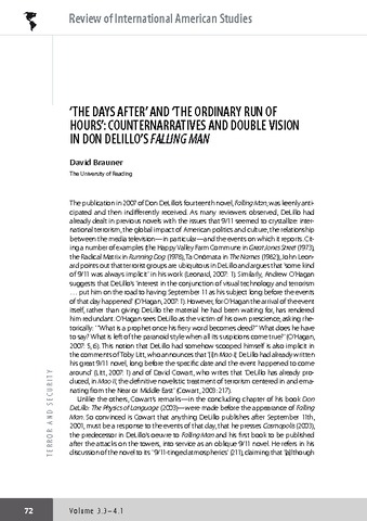 Brauner, D. orcid id iconORCID: https://orcid.org/0000-0003-2817-7847 (2009) "The days after" and "the ordinary run of hours": counternarratives and double vision in Don DeLillo's 'Falling Man'. Review of International America Studies, 3/4 (3/1). pp. 72-81. ISSN 1991-2773