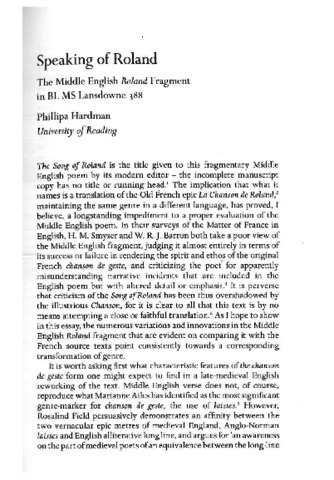 Hardman, P. (2008) Speaking of Roland: the Middle English Roland fragment in BL MS Lansdowne 388. Reading Medieval Studies, XXXIV. pp. 99-121. ISSN 0950-3129