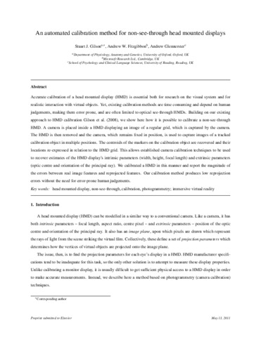 Gilson, S. J., Fitzgibbon, A. W. and Glennerster, A. orcid id iconORCID: https://orcid.org/0000-0002-8674-2763 (2011) An automated calibration method for non-see-through head mounted displays. Journal of Neuroscience Methods, 199 (2). pp. 328-335. ISSN 0165-0270 doi: 10.1016/j.jneumeth.2011.05.011