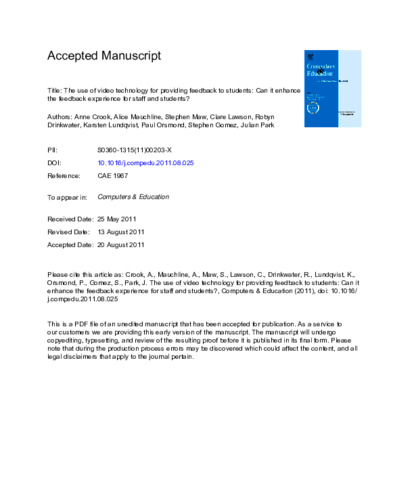 Crook, A., Mauchline, A. orcid id iconORCID: https://orcid.org/0000-0003-1168-8552, Maw, S., Lawson, C., Drinkwater, R., Lundqvist, K., Orsmond, P., Gomez, S. and Park, J. orcid id iconORCID: https://orcid.org/0000-0002-3430-9052 (2012) The use of video technology for providing feedback to students: can it enhance the feedback experience for staff and students? Computers & Education, 58 (1). pp. 386-396. ISSN 0360-1315 doi: 10.1016/j.compedu.2011.08.025