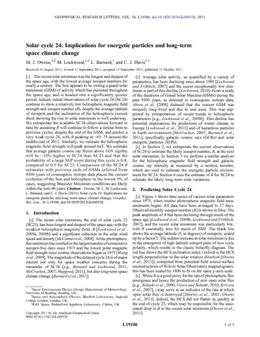 Owens, M. J. orcid id iconORCID: https://orcid.org/0000-0003-2061-2453, Lockwood, M. orcid id iconORCID: https://orcid.org/0000-0002-7397-2172, Barnard, L. and Davis, C. J. orcid id iconORCID: https://orcid.org/0000-0001-6411-5649 (2011) Solar cycle 24: implications for energetic particles and long-term space climate change. Geophysical Research Letters, 38. L19106. ISSN 0094-8276 doi: 10.1029/2011GL049328